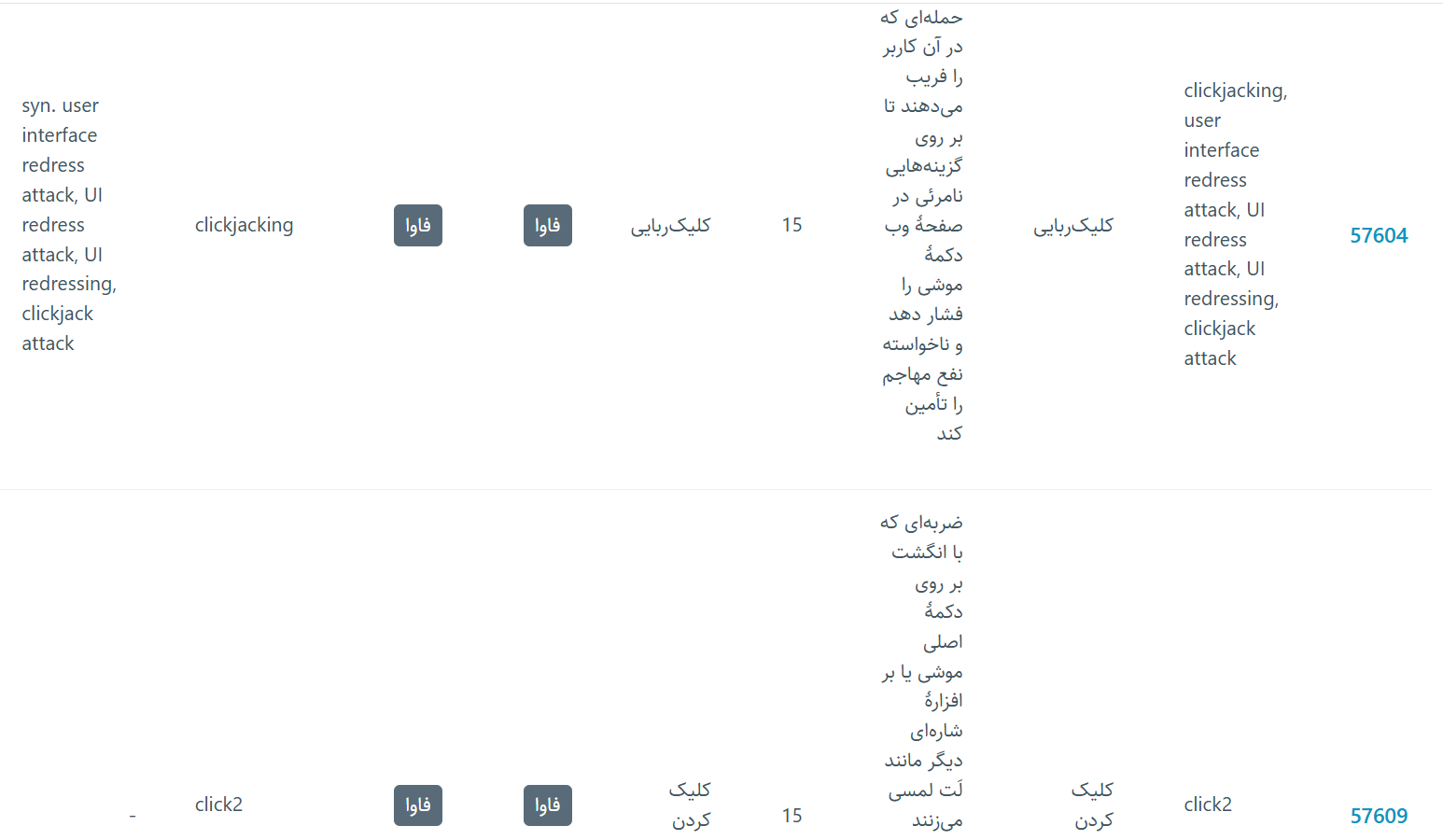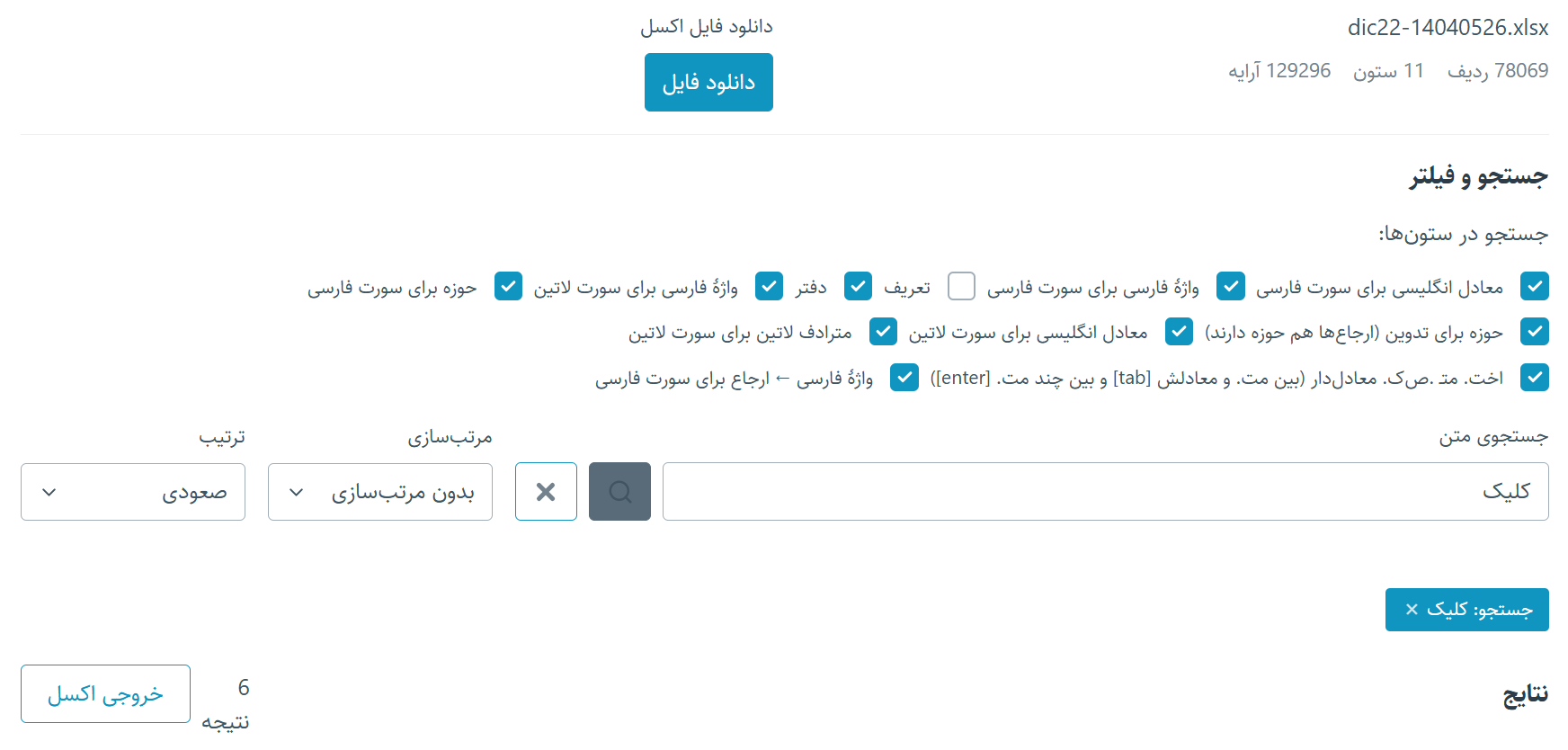 در ادامه، کلمۀ کلیک رو جستوجو کردم و ششتا نتیجه به دست اومد که در تصویر دوم میبینید. فقط آرایهها نمیدونم چیه. فکر کنم منظور از آرایه همون حوزه باشه که مثلاً اینجا واژهٔ کلیک تو حوزۀ فاوا (فناوری اطلاعات) هست. و نمیدونم چرا برای بعضی از اکسلهام آرایه رو مینوشت صفر و حوزهها رو مثل این تو مستطیل لینک نمیکرد. دلیل اینکه حوزه رو دو بار آوردم هم اینه که یکیش برای تدوینه. بعداً پاک میکنم اون ستون رو. اونا برای ارجاع هم حوزه میخوان. ولی هنوز نمیدونم منظور از آرایه چیست و چه خاصیتی داره.