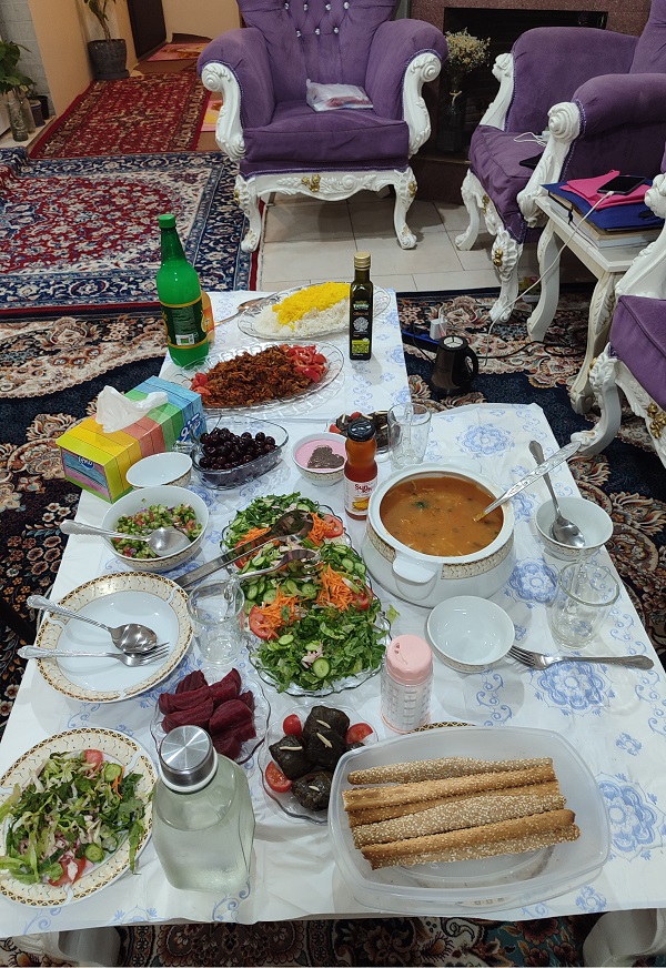 تا ظهر ایدهای نداشتم چی قراره درست کنم. صبح یه بسته گوشت از فریزر درآوردم گذاشتم بپزه. معمولاً این کارها رو مامان انجام میداد و میپخت آماده میکرد. این دفعه خواستم خودم انجام بدم ببینم چی از آب درمیاد. فقط چون گوشت گوسفند بود خیلی چرب بود. بعد از اینکه پخت، تو غذاساز خردش کردم و با پیاز و هویج و رب ترکیب کردم و یه خورشت مندرآوردی درست کردم که بهنظرم طعمش بد نشد. نگار و نرگسم دوست داشتن. عکسو یهو و عجلهای گرفتم. بشقاباشون دستشونه، برای همین تو عکس نیست :|